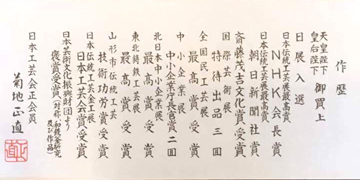 | 山形鋳物は、約960年前に発祥したとされています。菊地保寿堂は、慶長9年(1604)に山形城主・最上義光(もがみよしあき)公の御用鋳物師として当家初代の喜平治が擁護されたことに始まります。初代〜9代・喜平治、10代〜12代・卯之助、13代〜14代・熊治正直、そして現在15代正直へと受け継がれてきています。米国万国博覧会グランプリ賞受賞(1926)、日本伝統工芸展最高賞受賞2回、日本芸術文化財団褒賞受賞等々の数多くの褒賞を戴いております。また、日本古来よりの鉄材・砂鉄を用いて造られる和銑(わずく)釜の制作技術は、姻戚・長野家(現在2代目長野垤志)と共に技術復興し現在もその技術を頑に守り続けております。伝統と創造の現代ブランド「WAZUQU」は、欧米において高い支持と評価をいただいております。 |